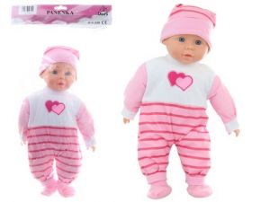 Miminko s měkkým tělíčkem. Miminko je oblečeno do barevného pyžámka, které lze sundat (suchý zip). Po zmáčknutí bříška miminko vydává zvuky. Napájení na 3 AG13 baterie (jsou součástí). Rozměry miminka cca 40 x 17 x 7 cm. Baleno v plastovém sáčku. Věk 3+