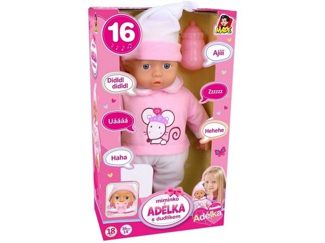 Miminko Interaktivní Adélka, 36cm, 16 funkcí. Panenka udělá radost všem malým slečnám je výborná kamarádka, která vyrostla do velikosti 33 cm a je určena pro holky od 18měsíců. Panenka po stisknutí tělíčka vydává zvuky. Napájení na baterie: 2 x 1,5V (AAA) jsou součástí baleníRozměr: 16,50 x 10,50 x 36 cm