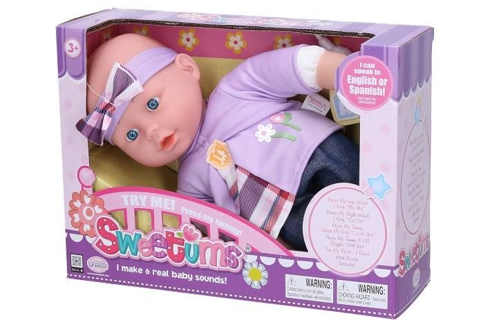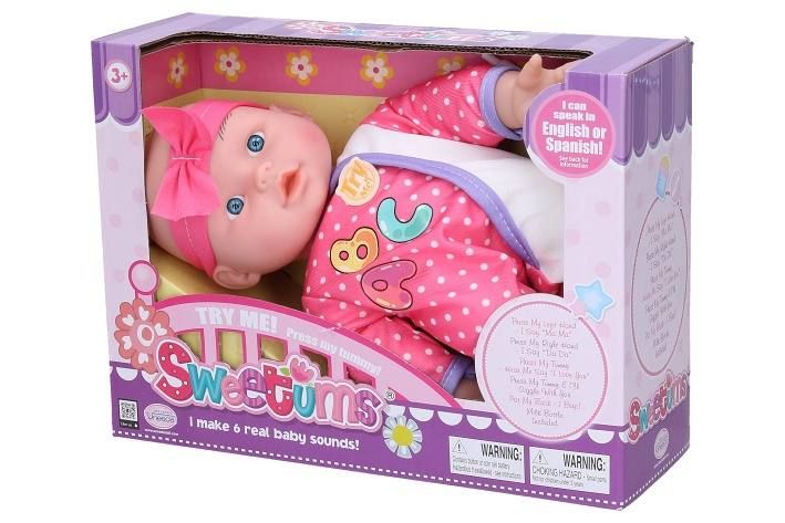 Miminko měkké mluvící. Velikost 28 cm. Součástí láhev. Stlačením levé dlaně říká "máma", stlačením pravé dlaně říká "táta", stlačením hrudníku říká "I love you" a směje se. 3xAG13 baterie součástí. 3 varianty.
