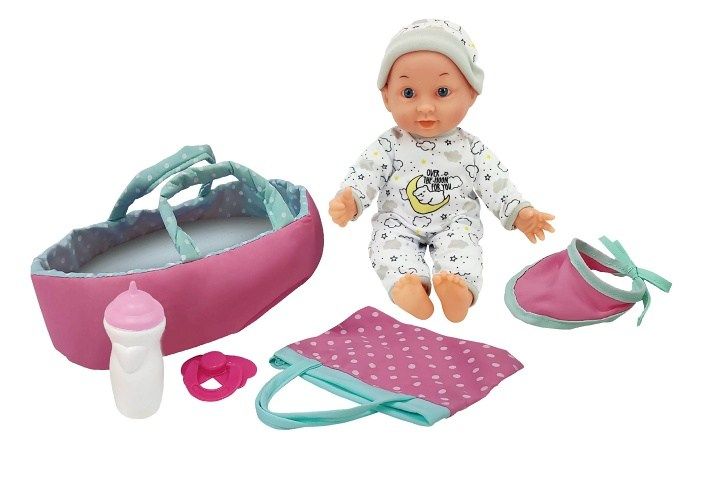 Miminko měkké s přenosnou taškou. Velikost 30 cm. Obsah - miminko, přenosná taška, bryndák, láhev. 2 varianty - růžová, bílá.