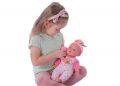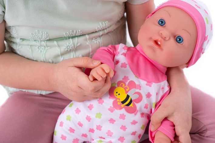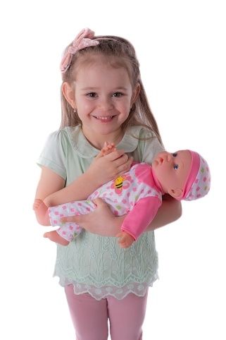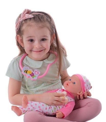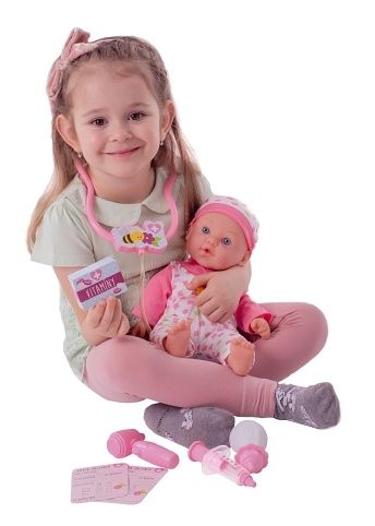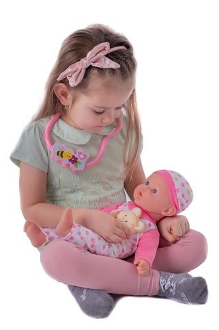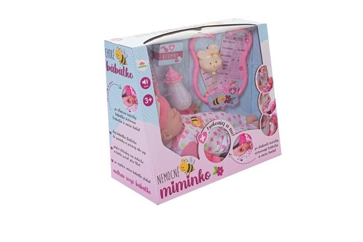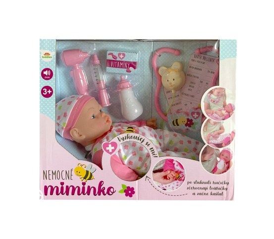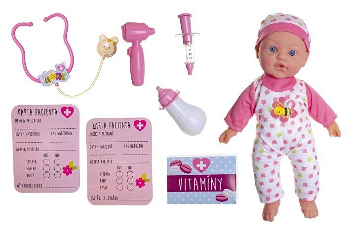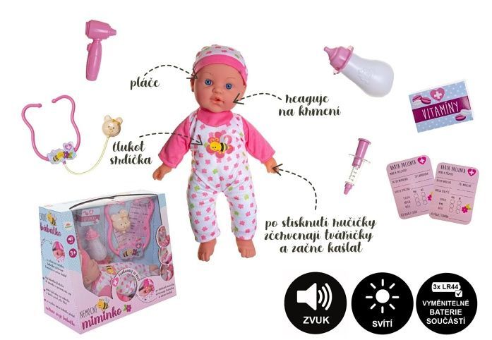 Panenka má měkké tělo a je se zvukem a světlem. Po stisknutí ručičky zčervenají tvářičky a začne kašlat. Přilož stetoskop na srdíčko a uslyšíš jeho tlukot. Po injekci začne miminko plakat. Dej miminku lahvičku do pusinky a poslouchej, jak pije. Uzdrav svoje miminko. Balení obsahuje stetoskop, injekční stříkačku, kukátko do uší, lahvičku, krabičku s nápisem VITAMÍNY a kartu pacienta. Panenka je velikosti 36 cm. Baterie 3x AG13 jsou součástí balení a slouží pouze pro předváděcí účely, doporučujeme baterie vyměnit za nové.