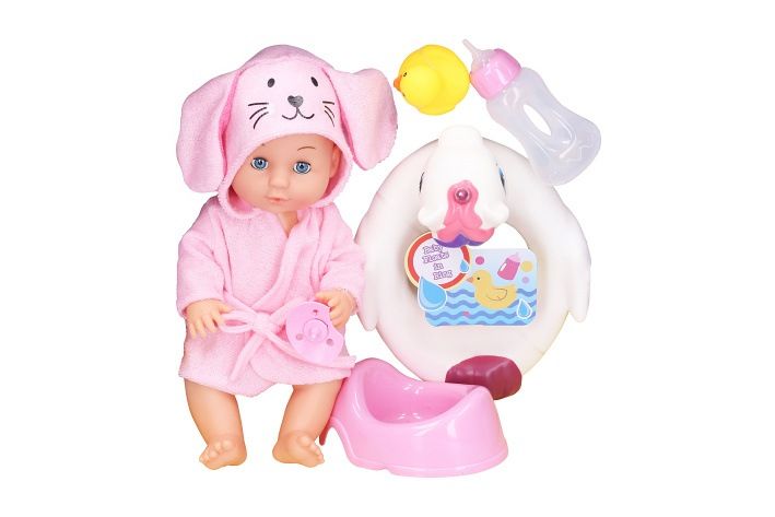 Miminko s kruhem. Velikost 27 cm. Obsah balení - miminko, župan, dudlík, nočník, kruh pro miminko, lahvička, kačenka.