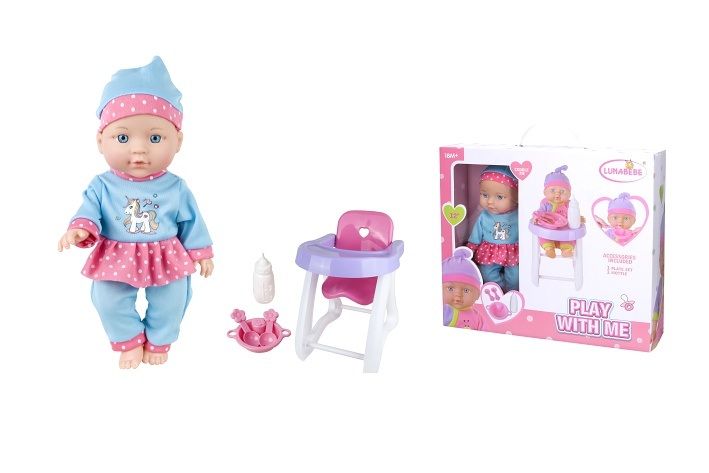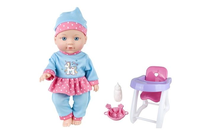 Miminko s židličkou a příslušenstvím. Velikost 30 cm. Balení obsahuje jídelní židličku, misku s lžičkou a vidličkou, lahvičku. 2 varianty oblečení - modré, růžové.