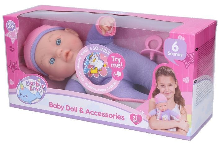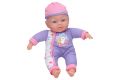 Miminko se zvukovými efekty. Velikost 31 cm. Měkké tělíčko. Zvukové efekty stlačením bříška (6 zvukových efektů). 2xAG3 baterie součástí. Součástí lahvička, dudlík.