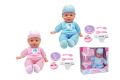 Miminko se zvuky a doplňky. Velikost 41 cm. Balení obsahuje miminko, talířek s vidličkou a lžičkou, chrastítko a plenku. Po stlačení bříška vydává zvuky: říká mama, papa, směje se, žvatlá. Měkké tělíčko. 2 varianty - růžová, modrá.