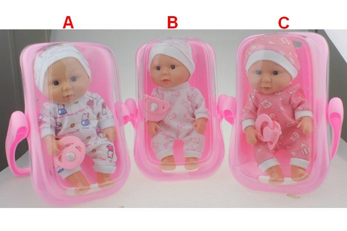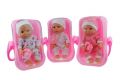 Malé miminko v růžovém nosítku s čepičkou a oblečkem v různých barvách.