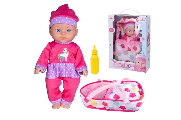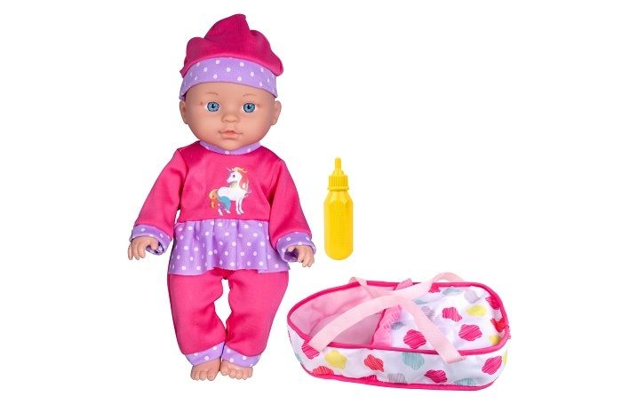 Miminko v přenosné tašce. Velikost 30 cm. Měkké tělíčko. Balení obsahuje miminko, tašku s popruhy na přenášení ležícího miminka, lahvičku.