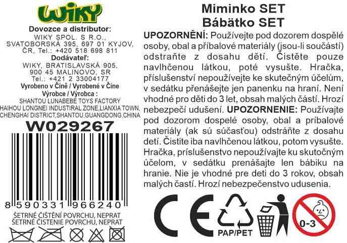 Miminko v přenosném houpacím sedátku. Velikost 28 cm. Balení obsahuje miminko, dudlík a sedátko s rukojetí pro přenášení.