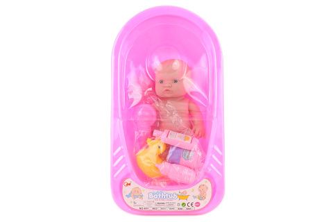 Plastové miminko s vaničkou. Sada obsahuje vaničku, sprchu, kačenku, šampón lahvičku pudr, žínku a miminko. Rozměr miminka cca 23 cm. Rozměr balení cca 40 x 21,5 x 9 cm. Věk 1+
