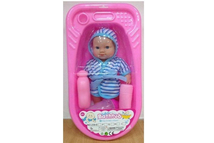 Miminko na hraní je oblečenou v župánku. Součástí balení je plastová vanička, lahvička a další doplňky. Velikost miminka je 24 cm.