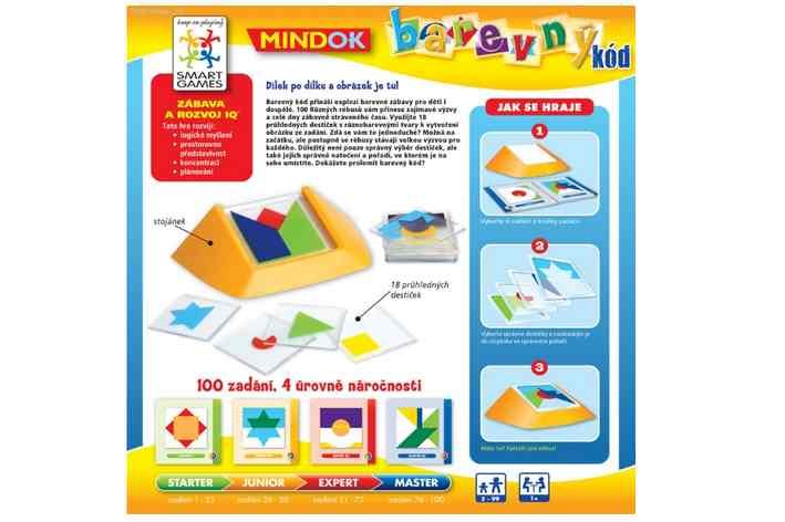 Hlavolamová hra pro 1 hráče z řady SMART games. Dílek po dílku a obrázek je tu! Barevný kód přináší explozi barevné zábavy pro děti i dospělé. 100 Různých rébusů zadání vám přinese zajímavé výzvy a celé dny zábavně stráveného času. Využijte 18 průhledných destiček s různobarevnými tvary k vytvoření obrázku ze zadání. Zdá se vám to jednoduché? Možná na začátku, ale postupně se rébusy stávají velkou výzvou pro každého. Důležitý není pouze správný výběr destiček, ale také jejich správné natočení a pořadí, ve kterém je na sebe umístíte. Dokážete prolomit barevný kód?