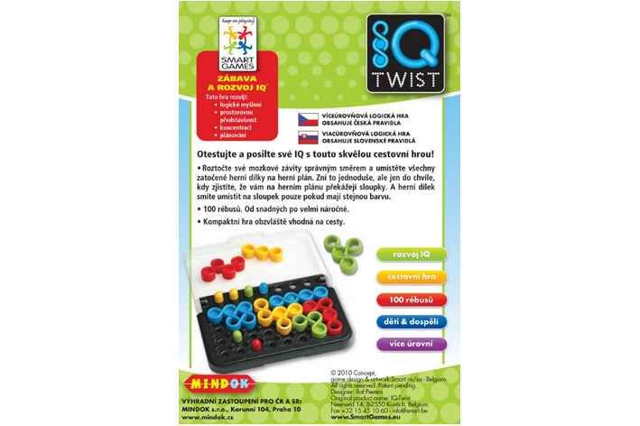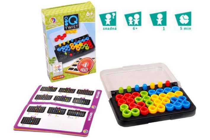 Hlavolamová hra pro 1 hráče z řady SMART games. Otestujte a posilte své IQ s touto skvělou cestovní hrou! Roztočte své mozkové závity správným směrem a umístěte všechny zatočené herní dílky na herní plán. Zní to jednoduše, ale jen do chvíle, kdy zjistíte, že vám na herním plánu překážejí sloupky. A herní dílek smíte umístit na sloupek pouze pokud mají stejnou barvu. - Tato kompaktní hra, obzvláště vhodná na cesty obsahuje 100 rébusů - od snadných po velmi náročné.