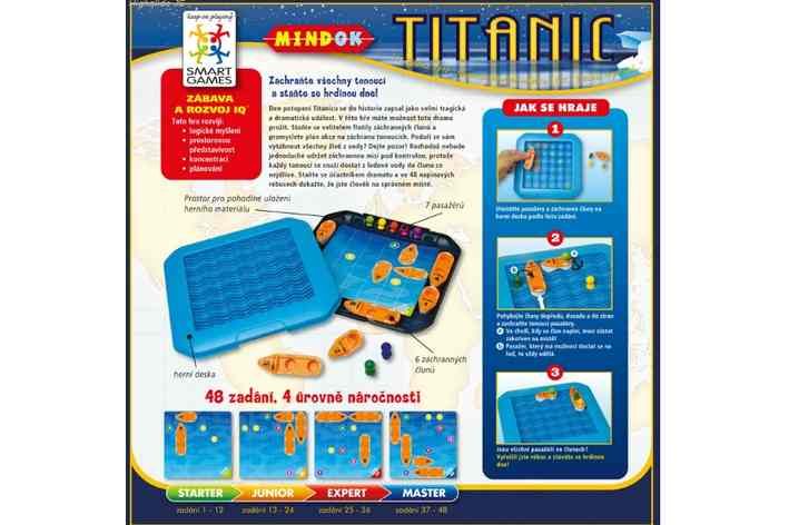 Hlavolamová hra pro 1 hráče z řady SMART games. Zachraňte všechny tonoucí a staňte se hrdinou dne! Den potopení Titanicu se do historie zapsal jako velmi tragická a dramatická událost. V této hře máte možnost toto drama prožít. Staňte se velitelem flotily záchranných člunů a promyslete plán akce na záchranu tonoucích. podaří se vám vytáhnout všechny živé z vody? Dejte pozor! Rozhodně nebude jednoduché udržet záchrannou misi pod kontrolou protože každý tonoucí se snaží dostat z ledové vody do člunu co nejdříve. Staňte se účastníkem dramatu a ve 48 napínavých rébusech dokažte, že jste člověk na správném místě.