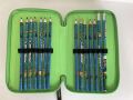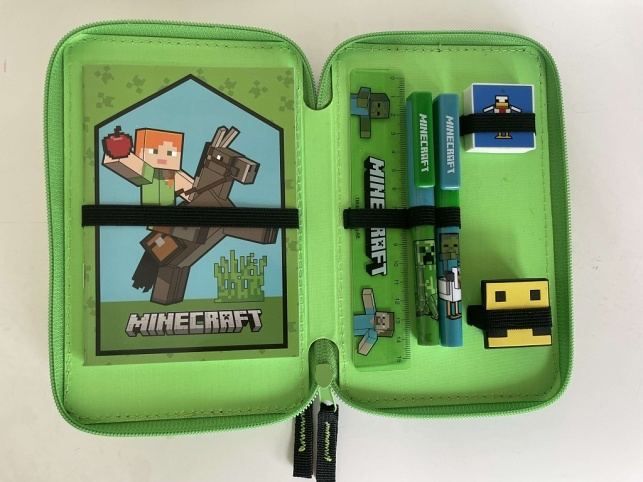 Dvoupatrový penál s uzavíráním na zip s náplní. Penál obsahuje 12 ks barevných pastelek, 2 ks obyčejných tužek, pravítko 15 cm, gumu, ořezávátko a set kuličkových per.