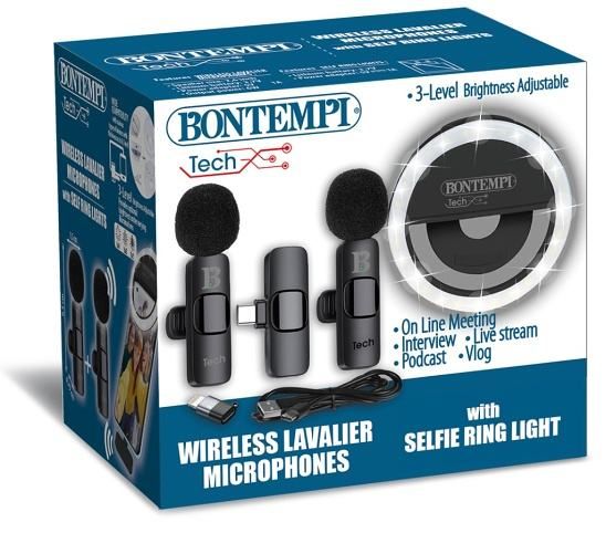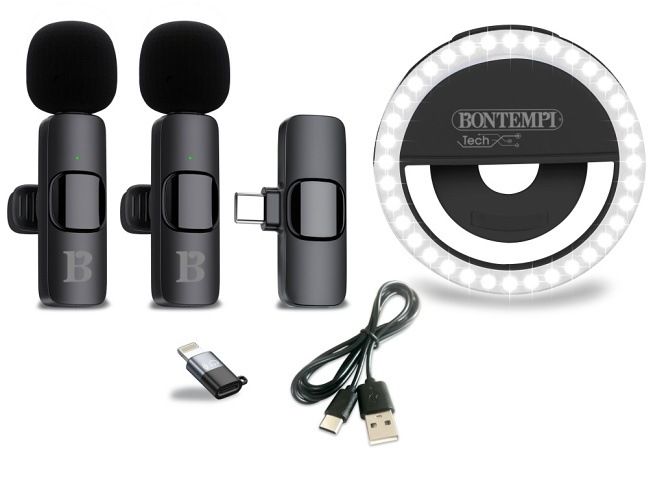 Kompaktní sada ideální pro natáčení videí, vlogování, podcasty, živá vysílání na Facebooku, YouTube a další platformy. Obsahuje mini kruhové LED světlo pro optimální osvětlení obličeje a dva bezdrátové klopové mikrofony pro čistý a profesionální zvuk. Mikrofony jsou kompatibilní s USB-C zařízeními (např. moderní chytré telefony a tablety). Snadné použití, ideální řešení pro tvůrce obsahu na cestách. Kruhové světlo- tři úrovně jasu. Na baterie: 3x CR1216 (jsou součástí balení)