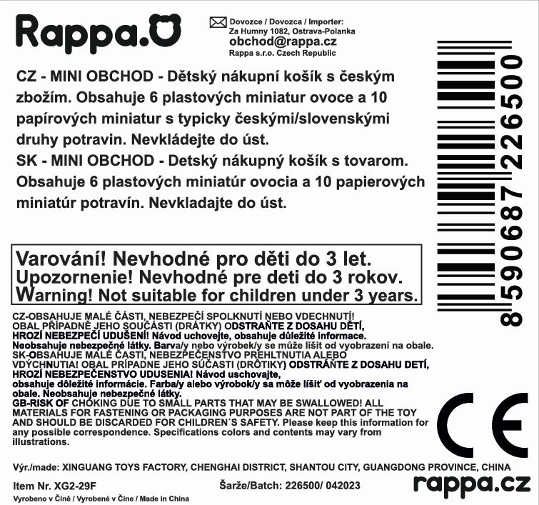 Hra na obchod patří k oblíbeným dětským kratochvílím, a tak výběrem tohoto doplňku jistě nesáhnete vedle! Přináší spoustu zábavy a zároveň podporuje rozvoj dětské představivosti. V našem nákupním košíku najdeš 10 ks papírových atrap potravin českého zboží a 6 ks ovoce. Navíc uvnitř balení najdeš A4 list s úkoly a ceníkem. Tak popadní dětský nákupní košík do ruky a hurá na nákupy! Na speciální podstránce rappa.cz/miniobchod si zákazníci mohou navíc ZDARMA stáhnout další miniatury potravin a vytisknout naučné úkoly o nakupování.