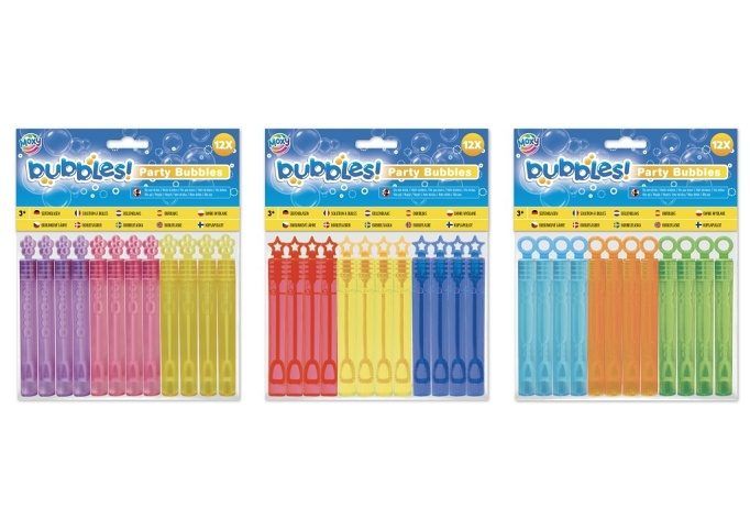 Mini party bublifukové tyčinky 12 ks – party balení obsahuje 12 bublifukových tyčinek ve třech barvách. Assort tří různých barevných provedení.
