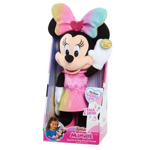 Děti mohou zpívat a tančit, zatímco Minnie myška zpívá „Minnie's Bow-Toon Are Waiting for You!“ Minnie myška předvádí úžasný výkon v třpytivém duhovém outfitu s odpovídající svítící mašlí! Tento interaktivní plyš má růžové srdce na jejích botách a její charakteristickou mašli! Její šaty mají dokonce rozkošný srdíčkový pásek v pase. Minnie Mouse má ideální velikost pro malé ruce a je dodávána ze super měkkých látek. Určitě se okamžitě stane nejlepší kamarádkou! Vyžaduje 2 x AAA baterie (součástí balení). Věk 3+ Na baterie: 3x AAA (jsou součástí balení)