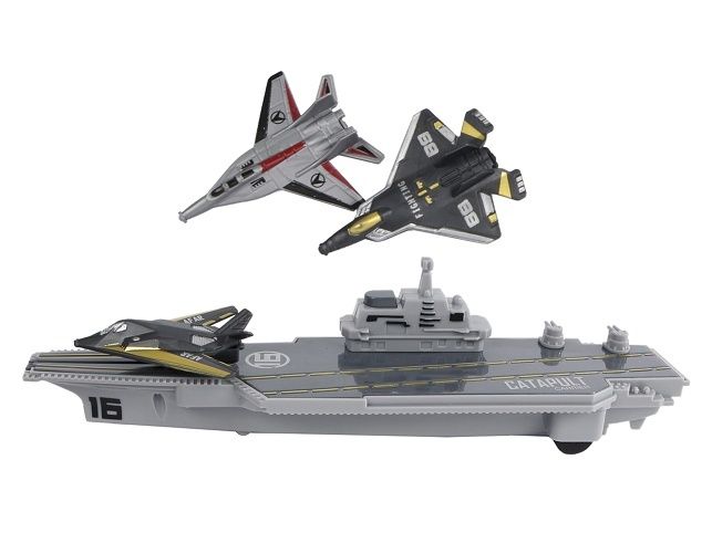 Vojenské stroje jsou oblíbenou hračkou kluků už po několik generací. Sada z kolekce Mission Control obsahuje letadlovou loď a 3 ks stíhaček. Letadlová loď má velikost 24 cm a je na setrvačník. Vhodné pro děti od 3 let.