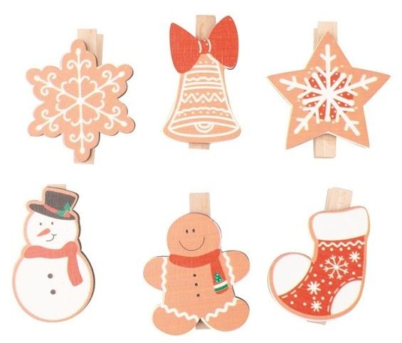 Mix dřevěných vánočních dekorací na kolíčku cca 3 x 4 x 0,3 cm, 6 ks v sáčku
