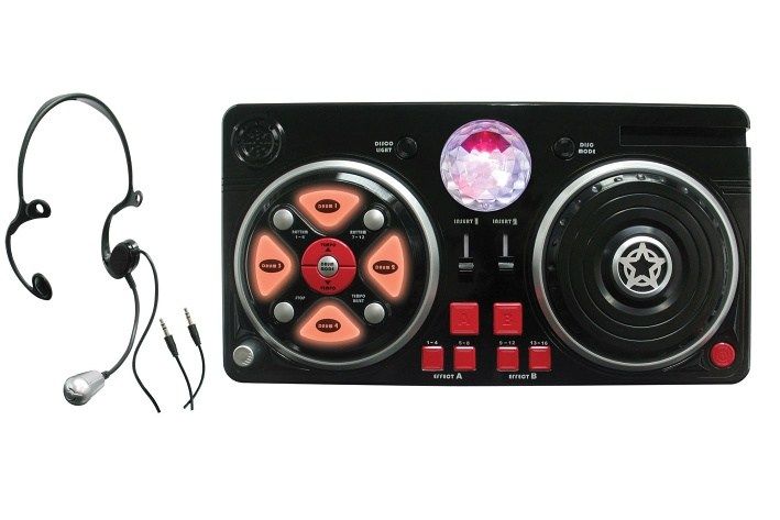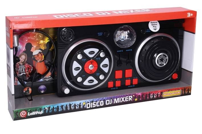 Mixážní pult s hlavovým mikrofonem. Rozměry 39x20 cm. Světelné a zvukové efekty. 4xAA baterie součástí. Svítící disco koule, 6 efektů disku, 16 efektů, 12 rytmů, 12 bubnů, nastavení tempa, hlasitosti, stojánek na mobil/mp3 přehrávač, automatické vypnutí pro šetření energie. Kabel pro připojení mobilu/mp3 přehrávače.
