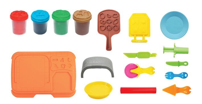Modelovací hmota Pec na pizzu výtvarný set. Obsah balení - pec na pizzu s formičkami na přísady, nástroje na přípravu pizzy, tvarovací nástroje, lopatka na pizzu, 4x56g kelímky modelovací hmoty (červená, modrá, zelená, hnědá). Návod na míchání barev na zadní straně obalu.