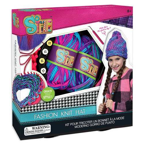 Sada moderního pletení. Upleť si vlastrnoručně originální čepici podle svého stylu. 8+ Balení obsahuje: příze, tklacovský stav, pletací jehlice, plastové jehly, konflíky, nitě, pomůcku k výrobě bambule, návod.