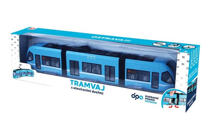 Moderní tramvaj v modré barvě, která jezdí na volný chod je perfektním dárkem pro všechny tramvajové nadšence. Dveře na jedné straně vozu lze manuálně otevřít. Tramvaj je vyrobená z plastu, je dlouhá 47cm a je velmi podobná tramvaji, která jezdí ulicemi v Ostravě. Tato hračka byla vyrobena ve spolupráci s Dopravním podnikem města Ostravy a městem OSTRAVA!!!
