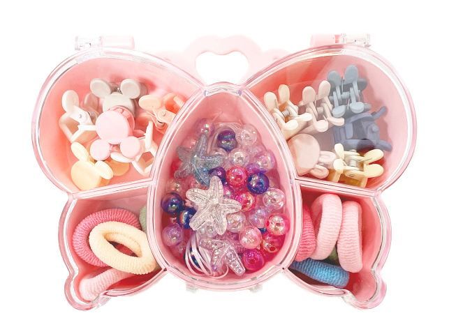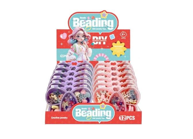 Modní doplňky set v krabičce. Obsah balení - náramky, gumičky, korálky, sponky. Display box - 12 ks. 2 varianty - růžová, fialová. Přesné rozměry 12,5x2,5x10 cm.