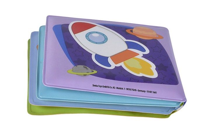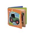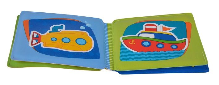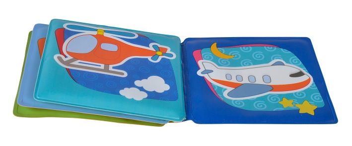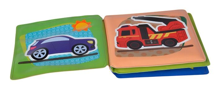 Omyvatelná knížka pro nejmenší s "pískátkem" na přední straně. Má celkem 8 stran s obrázky dopravních prostředků. Rozměr zavřené knížky: 10x10cm.