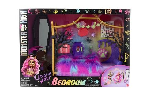 Herní set Monster High™ Úplňková ložnice má vše, co si jen vlkodlačí slečinka může přát! Pro maximální pohodlí Clawdeen je k dispozici monstrózní nábytek, jako postel, stůl, minilednička a zrcadlo a démonické dekorace. Nechybí ani spousta drobností a arch samolepek, který pomůže vyšperkovat ložnici podle individuálního vkusu. Panenka není součástí balení.Věk 4+