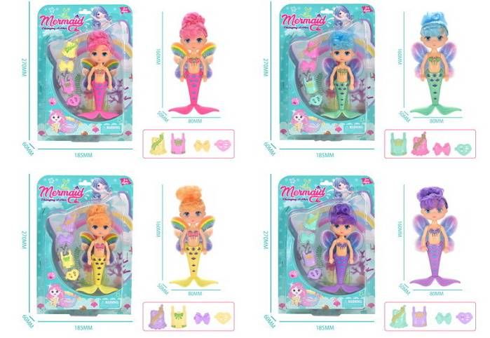 Mořská víla s oblečkem. Velikost 13 cm. 4 varianty ploutve - růžová, zelená, žlutá, fialová.