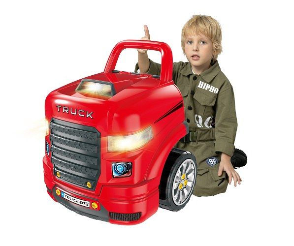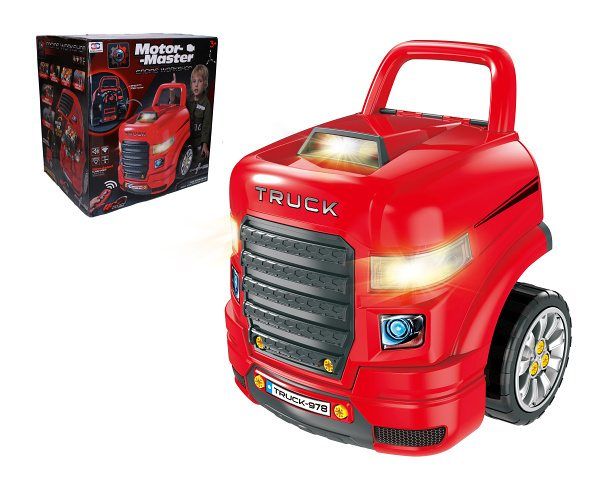 Motor šroubovací na dálkové ovládání - kamion. Rozměry 40x39x47 cm. Obsahuje 61 součástek. Klíče na dálkové ovládání (tlačítka pro odemčení, zamčení, klakson). Svítící přední světla, klakson, řadící páka, výstražné světlo, startovací tlačítko, odklápěcí kapota, osvětlení motoru, měření oleje. Světelné a zvukové efekty. 3xAA pro motor nejsou součástí, 1xCR2055 pro klíče součástí.