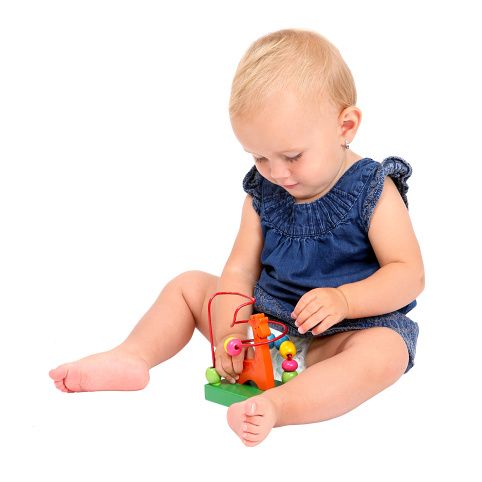 Labyrint s žirafkou na dřevěném podkladu pomáhá dětem nejen seznamovat se s barvami, ale především trénovat jemnou motoriku při posouvání korálků.