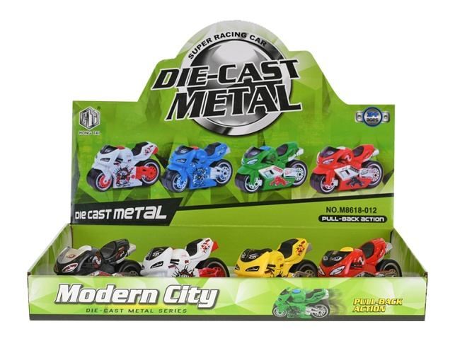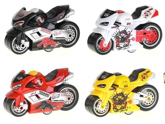 Závodní motorka z kovu na zpětný chod pro všechny milovníky těchto strojů. Motorka měří 9 cm. Jistě bude oblíbenou hračkou všech malých závodníků. Ve čtyřech barevných variantách.