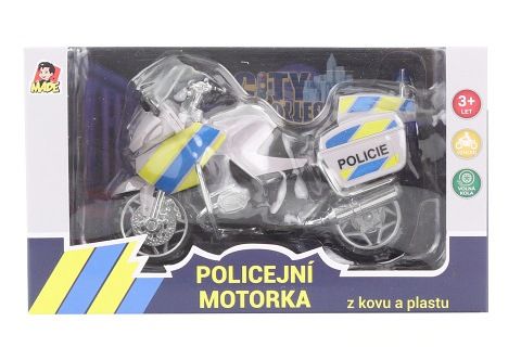 Kovová policejní motorka o rozměrech cca 12 x 7 x 6 cm. Rozměr balení cca 17 x 10 x 6,5 cm. Věk 3+