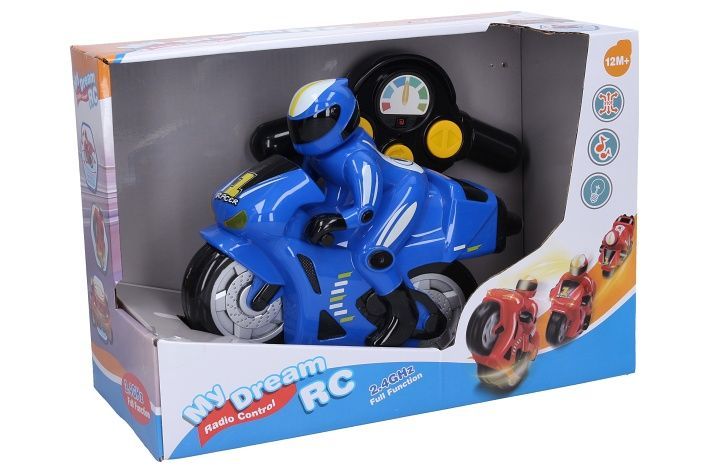 Motorka s efekty RC na dálkové ovládání. Rozměry 23x11x19 cm. Ovladač ve tvaru řídítek. Frekvence 2. 4GHz. Světelné a zvukové efekty. 4xAA baterie do vytahovacího plastového boxu ze zadní strany motorky, 2xAA do ovladače nejsou součástí. Přepínač ON/OFF na spodní straně motorky a na ovladači. Ovladač - pohyb všemi směry, tlačítko - demo režim (podržením 3 vteřiny - vypnutí/zapnutí zvukových efektů.