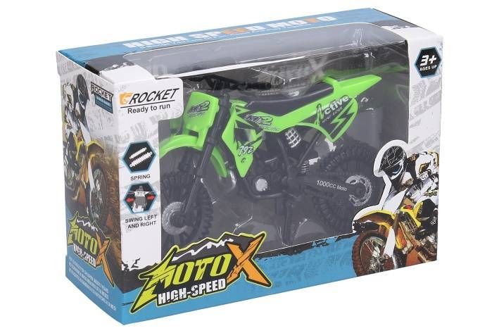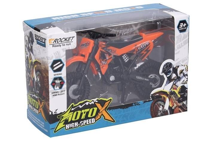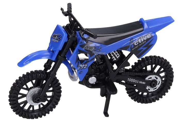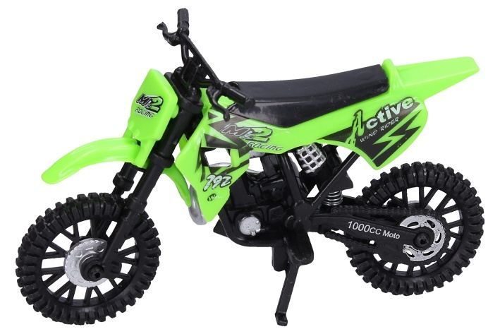 Motorka terénní. Velikost 12x5x8 cm. Volná kola. Display box - 12 ks. 3 varianty - oranžová, zelená, modrá.