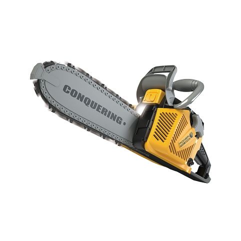 Motorová pila. Rozměry 43x10x18,5 cm. Světelné a zvukové efekty. 3xAAA baterie nejsou součástí. Nastartování povytažením startovacího kabelu.