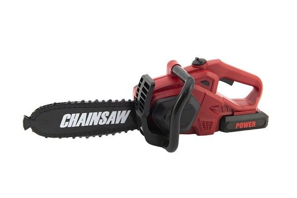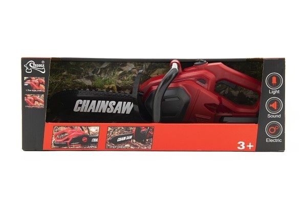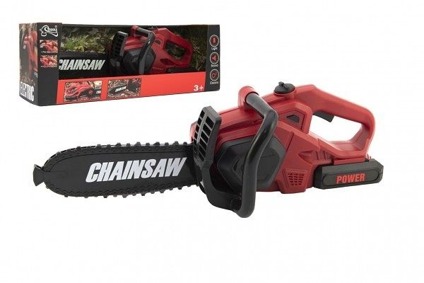 Tato řetězová pila může být skvělou hračkou ke hře na dřevorubce. Zatáhněte lehce za startér umístěný po levé straně hračky, tím spustíme pilu, tlačítko na rukojeti dává do pohybu pro děti bezpečné ostří pily. Tato pila funguje skoro jako opravdová! Baterie 3x AA nejsou součástí balení.