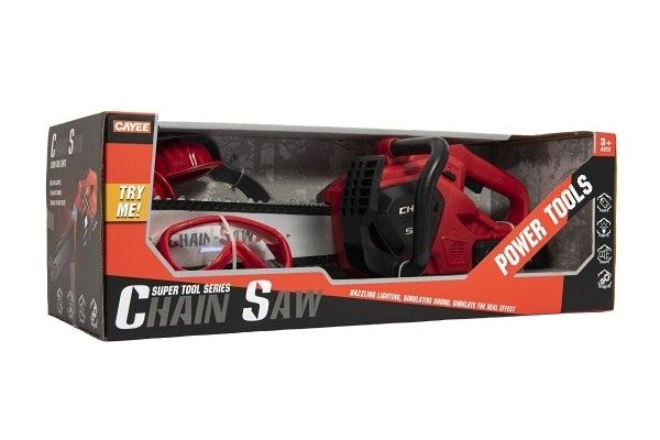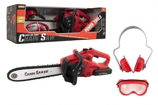 Tato řetězová pila může být skvělou hračkou ke hře na dřevorubce. Zatáhněte lehce za startér umístěný po levé straně hračky, tím spustíme pilu, tlačítko na rukojeti dává do pohybu pro děti bezpečné ostří pily. Součástí balení jsou také ochranné brýle a sluchátka. Tato pila funguje skoro jako opravdová! Baterie 3x AA nejsou součástí balení.