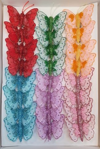 Dekorační motýl na kolíčku o šířce 5 cm. Vhodný pro aranžmá, květinové dekorace, dárkové balení i kreativní tvoření.