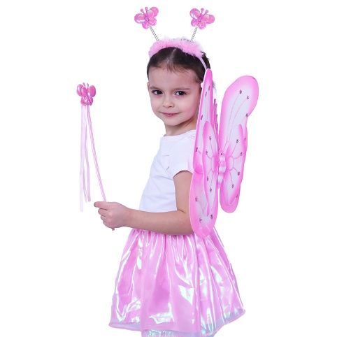 Roztomilá růžová motýlí křidélka na gumičku jsou určena pro holčičky ve věkovém rozmezí 3-10 let (104-150 cm). Součástí této karnevalové sady je také čelenka s motýlky na pružinkách a hůlka.
