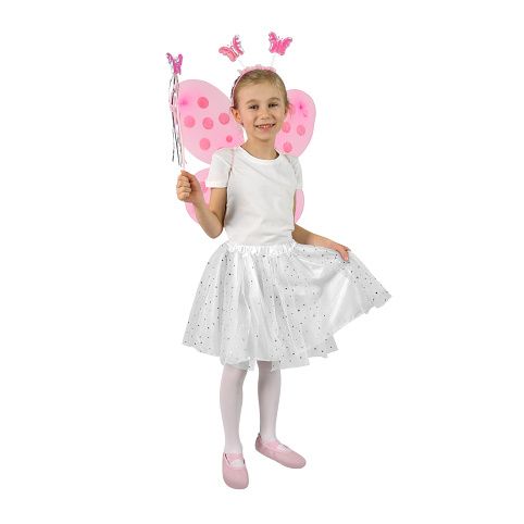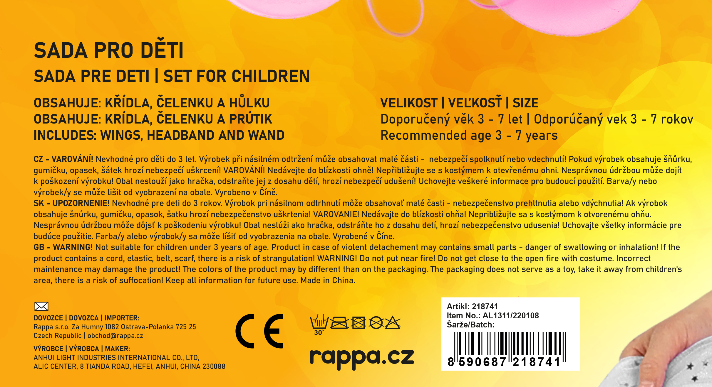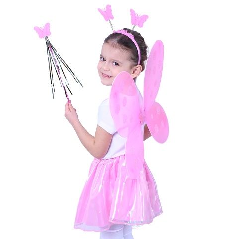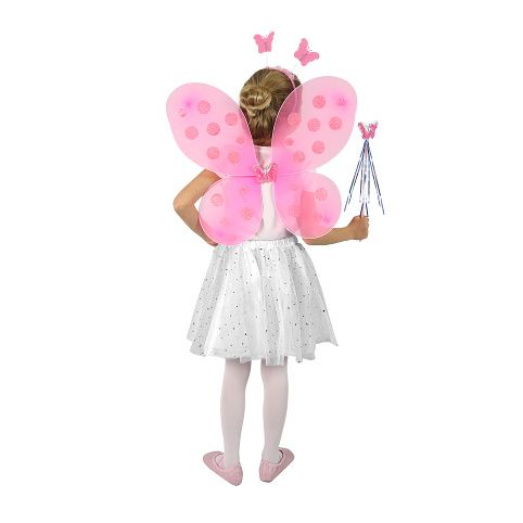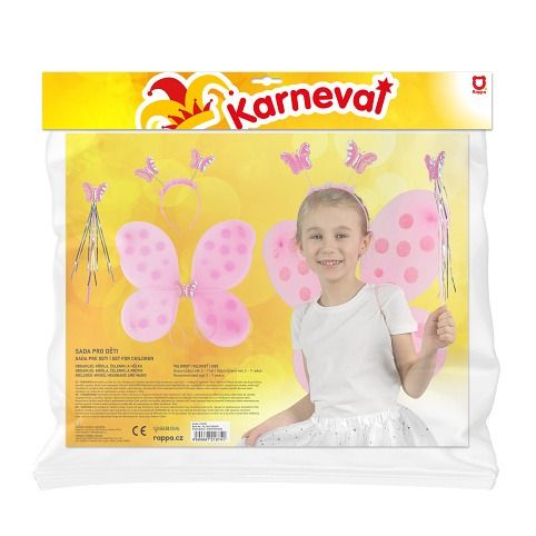 Roztomilá růžová motýlí křidélka na gumičku jsou určena pro holčičky ve věkovém rozmezí 3-10 let (104-150 cm). Součástí této karnevalové sady je také čelenka s motýlky na pružinkách a hůlka.