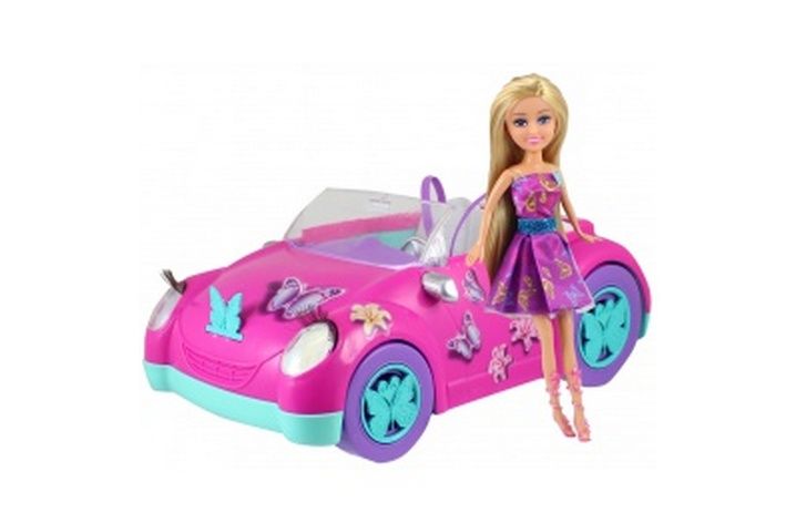 Panenka Sparkle Girlz v motýlích šatech se stylovým dvoumístným autem také v designu motýlů.
