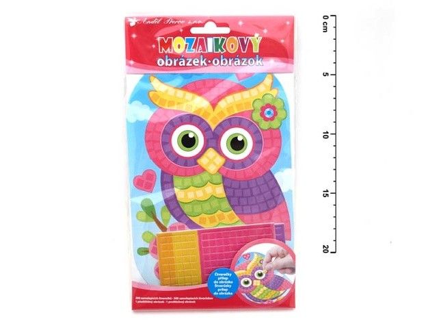 Mozaika se samolepkami s obrázkem sovy. Mozaika obsahuje lepicí čtverečky a předlohu. Z lepícího čtverečku odstraňte krycí folii a nalepte na určené místo na předloze. Dokončený obrázek můžete dát do stojánku. Rozměr: 25x14cm