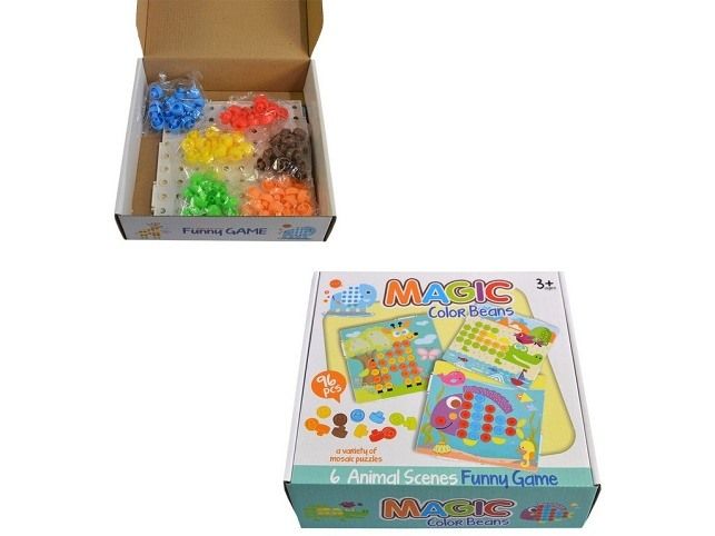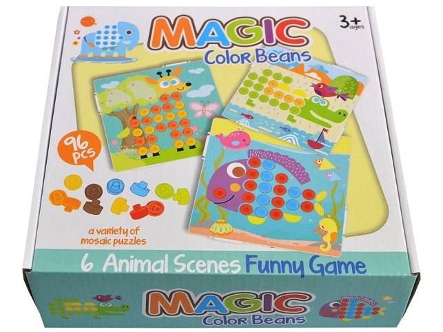 Tato mozaika obsahuje 6 barevných předloh různých prostředí, ve kterých žijí zvířátka. Dopň tělo zvířátka z různobarevných kloboučků mozaiky. Sada obsahuje celkem 96 dílů. Rozměry boxu 25 x 26 x 7 cm. Vhodné pro děti od 3 let.