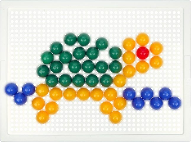 Skládejte barevné kloboučky na podkladovou desku. balení obsahuje 80 ks kloboučků a pytlíček na uložení. Předlohu najdete na zadní straně krabice.