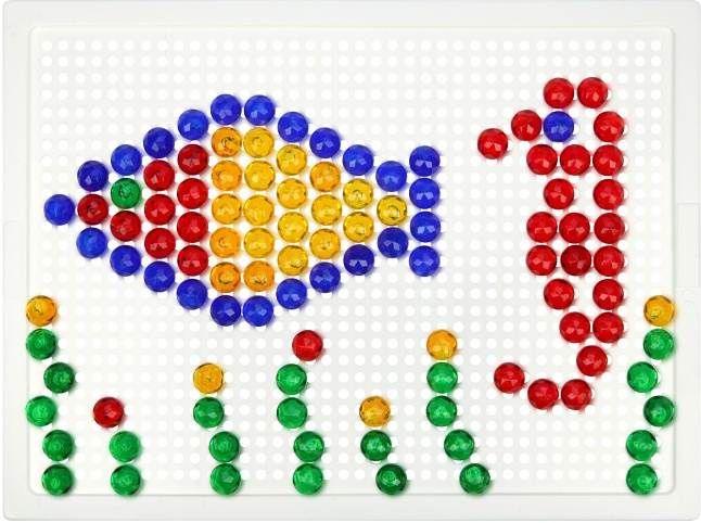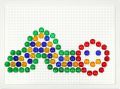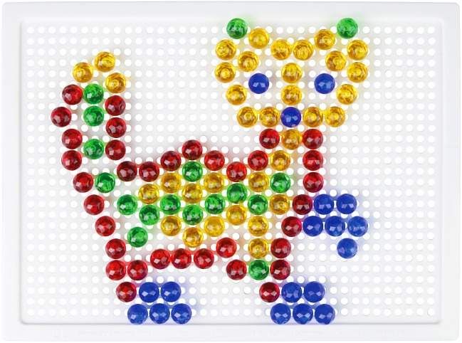 Skládejte barevné kloboučky na podkladovou desku. Balení obsahuje 140 ks kloboučků a pytlíček na uložení. Předlohu najdete na zadní straně krabice.