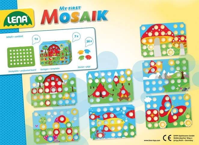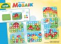 Mozaika pro nejmenší, velikost kolíčku 33 mm, průměr hlavy 20 mm, 36 kolíčků a 7 barevných šablon (předloha k umisťování kolíčků). Barevné kloboučky, které se skádají na podkladovou desku s předtišněným motivem, dokážou vytvořit nádherné obrázky. Díky velkým dírám a količkům nebudou mít ani ti nejmenší problém s umisťováním.